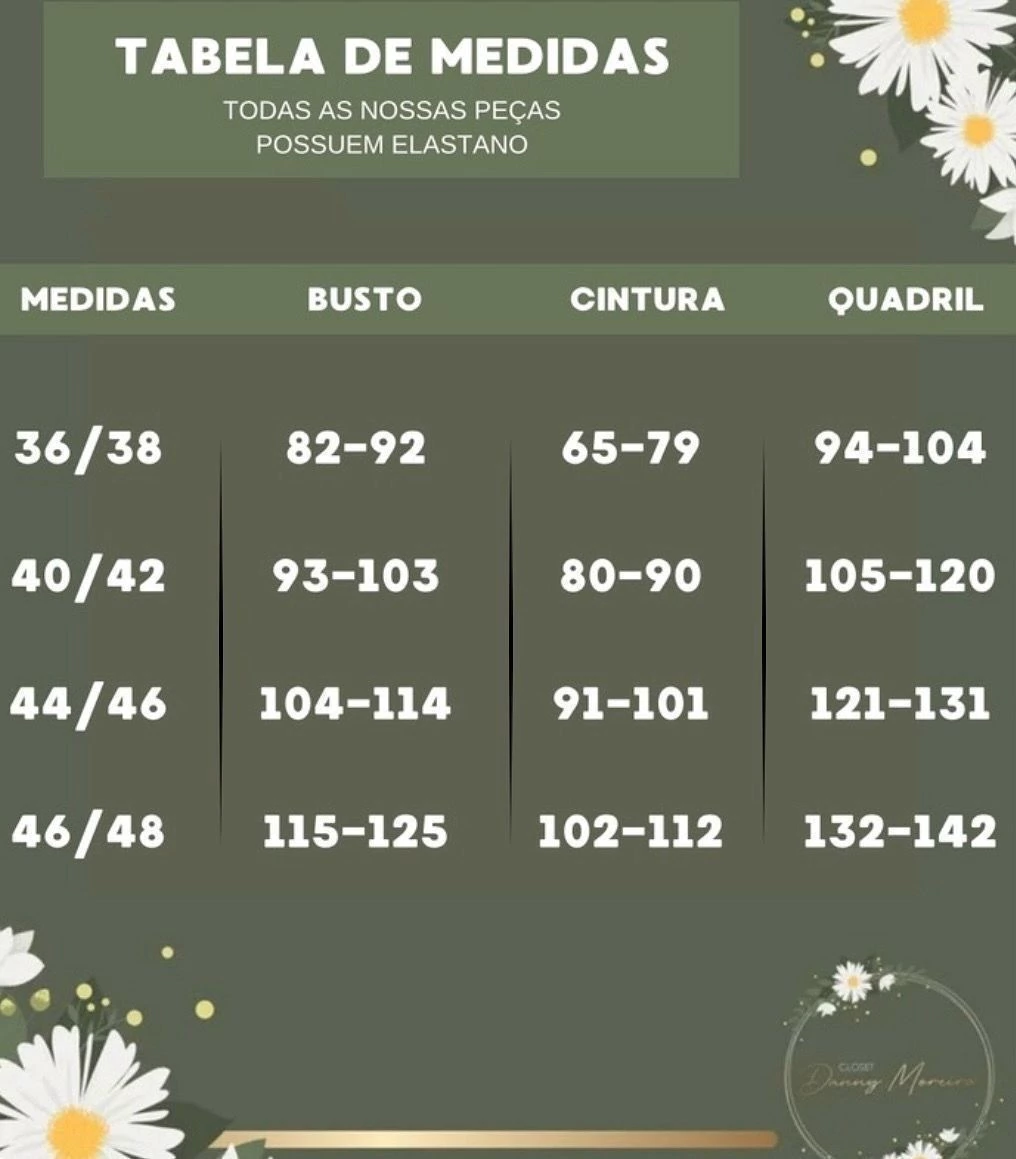 A modelo está usando o tamanho 44-46 ela possui 164 de altura, 93 de busto, 120 de quadril e 85 de cintura.